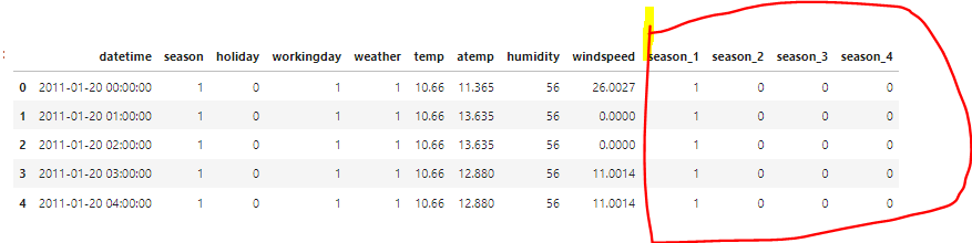 첫번째로 계절을 알려주는 season 컬럼을 원핫 인코딩하겠습니다.